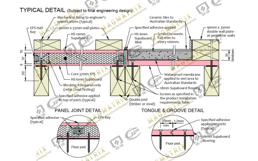Napravili smo ih MGO podoftne ploče kombiniranjem magnezijevog oksida s ne-organskim mineralima i aditivima. Pojačani su mrežicom od stakloplastike kako bi ih duže trajali. Većina graditelja odabire strukturne ploče debljine 3/4 "-upravo za jake, trajne podove. Ploče se zaključavaju zajedno s rubovima jezika i unosa, što pomaže ravnomjerno širiti težinu i održava pod stabilan.